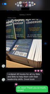 If you lead a team of leaders, do what our friend and client, Amani, did—buy copies for all of them and discuss it together. We even included a link to “Steps to Start an Unleashed Leadership Group” in the book. The whole process, including discussion questions, is already created for you. (Check out her text message below, where she ordered 40 copies for all her Service and Branch Managers.)